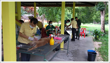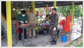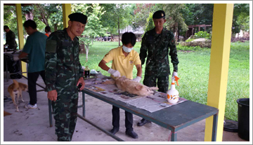 สำนักงานปศุสัตว์จังหวัดระนอง โดยกลุ่มพัฒนาสุขภาพสัตว์ออกปฏิบัติงานร่วมกับทหารหน่วยเฉพาะกิจกองกำลังเทพสตรี ผ่าตัดทำหมันสุนัขและแมวพร้อมฉีดวัคซีนป้องกันโรคพิษสุนัขบ้า ณ วัดมัสณิมเจริญธรรม(วัดป่าช้า) ตำบลบางริ้น อำเภอเมืองระนอง จังหวัดระนอง ในวัน ที่ 15 สิงหาคม 2559 ดำเนินกิจกรรมผ่าตัดทำหมันสุนัขและแมว จำนวน 12 ตัว ฉีดวัคซีนป้องกันโรคพิษสุนัขบ้า จำนวน 12 ตัว